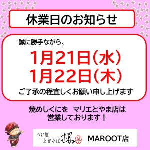 誠に勝手ながら、1月21日(水)1月22日(木)は休業日とさせていただきます。