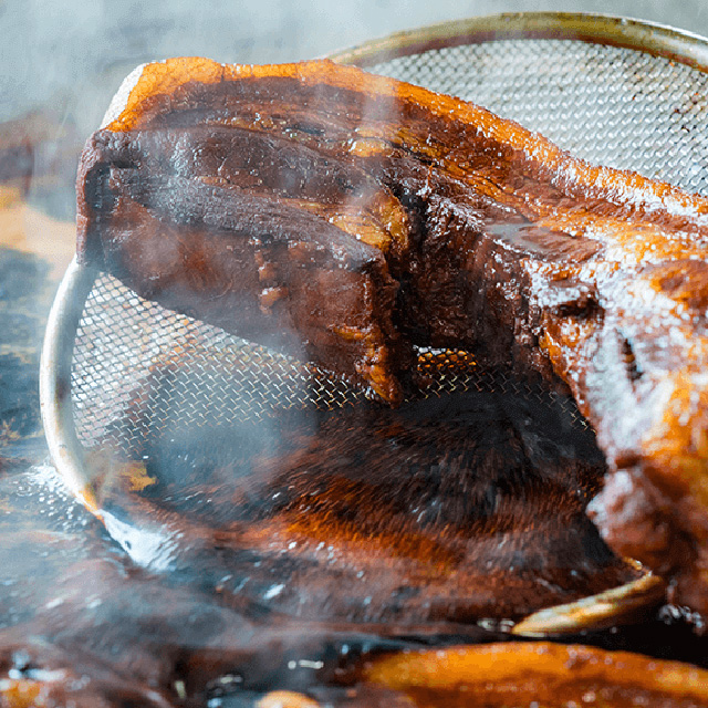 石川県大野のヤマト醤油から最高級ランク芳醇を主体に、日本では珍しいレンガ室醸造で有名な畑醸造の職人醤油 、地元九州、宮崎県にしか卸さない門外不出のたまり醤油、宮田醤油「おふくろ」。希少な甘口醤油3 種を秘伝の配合で 煮込む自家製焼豚。キレのある塩味と程よい甘さ、香ばしい醤油の香りとジューシーな食感をお楽しみください。